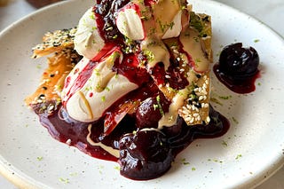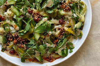 Pulled leek “noodle” salad, plus roasted leeks, crème fraîche, hazelnuts and sumac