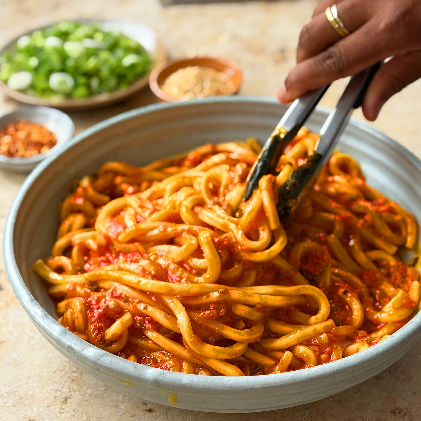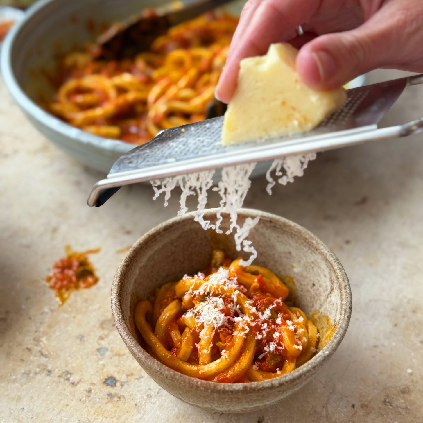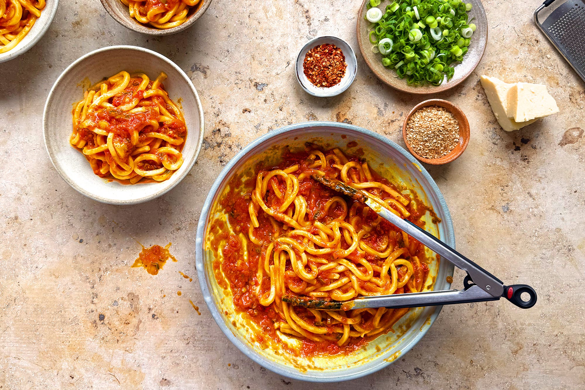 Thick udon noodles are a bit more fun than spaghetti, dare I say, with that chewy texture. The whole dish is super playful, but couldn’t be more straightforward: brown the tomatoes properly, let the butter and oil do their work, add the noodles (or cooked spaghetti if you prefer).