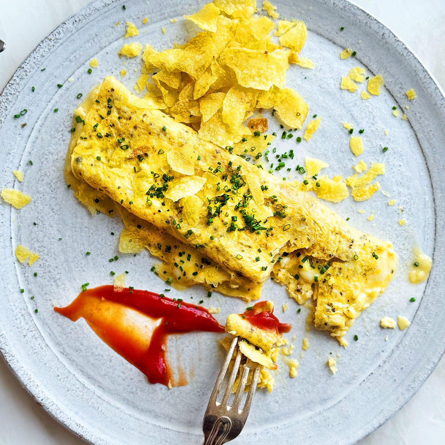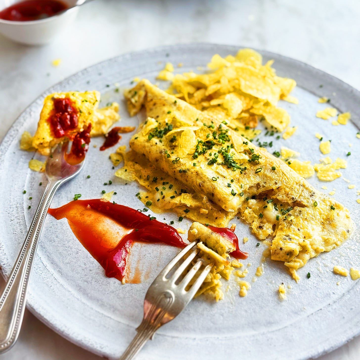 As someone who stuffs crisps into sandwiches, I'm entirely on board with crisps in an omelette. Inside, they soften into little pockets of flavour, while scattered on top they give a happy crunch. The saltiness means you barely need to season at all – though this does depend on which flavour you choose (I think prawn cocktail could be delicious).