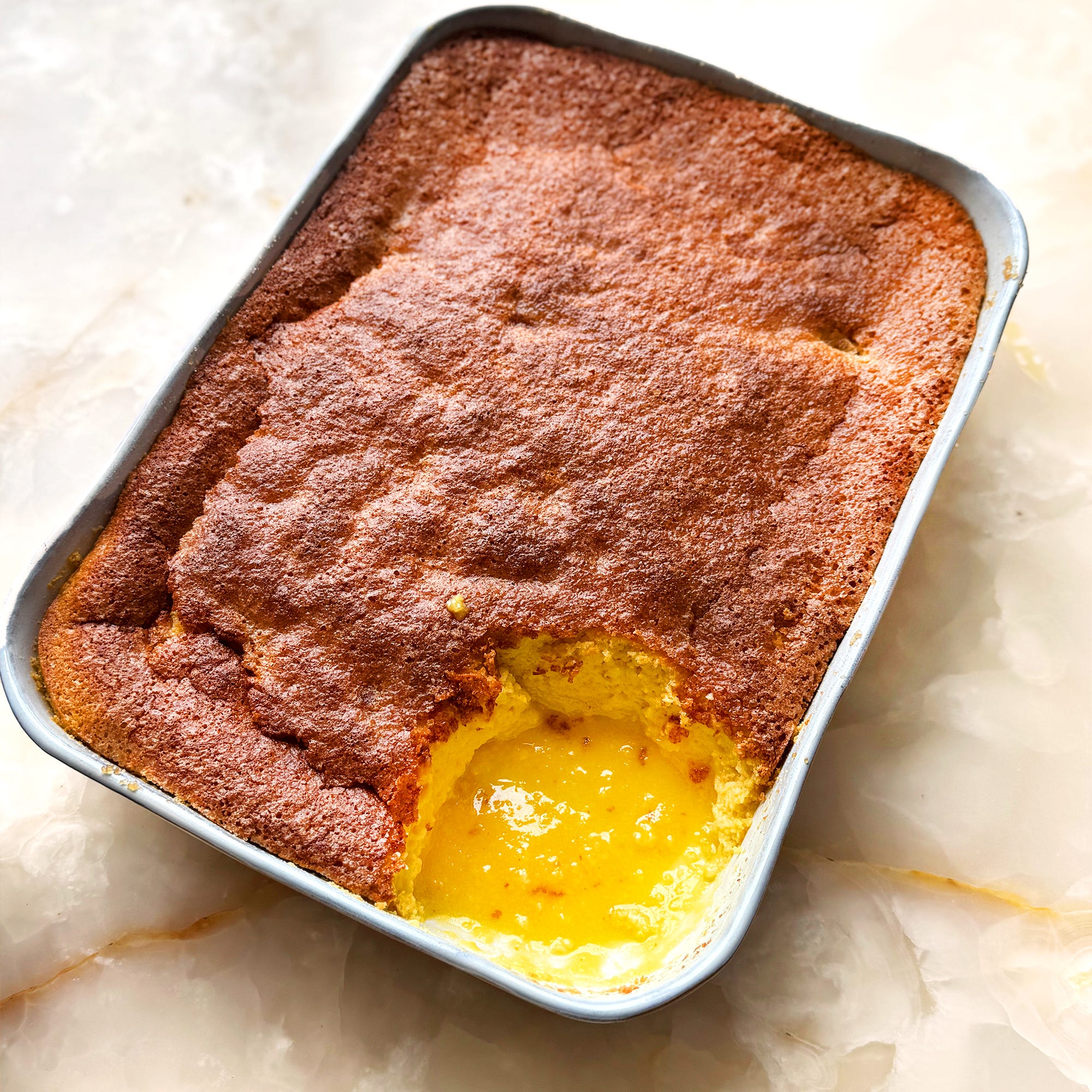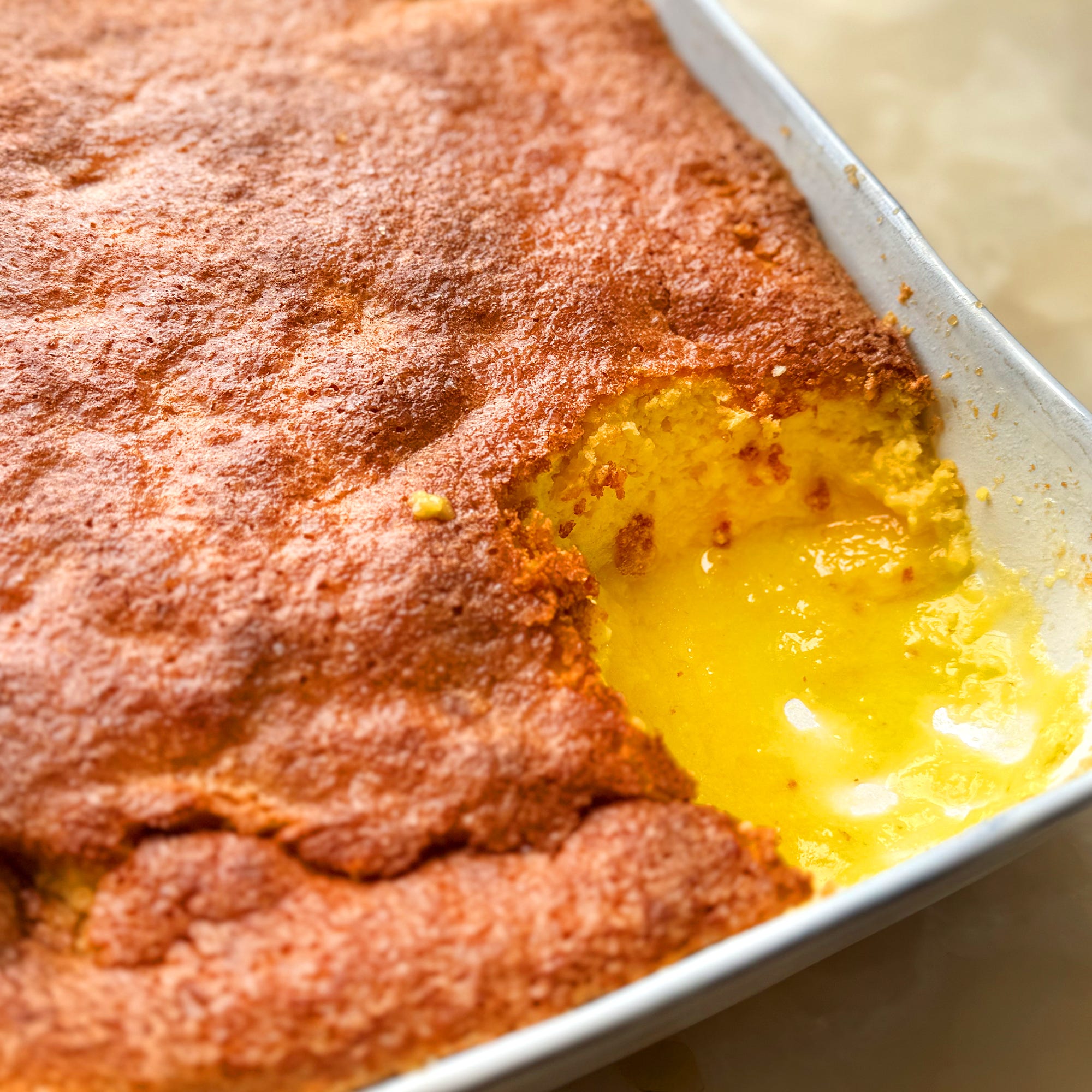 Once in the oven, this pudding quietly performs its alchemy, producing a soft sponge on top, with a sharp and glossy sauce underneath. The saffron, used sparingly (even a pinch will work), gives a subtle warmth and colour, though you can also do without it, if you prefer.