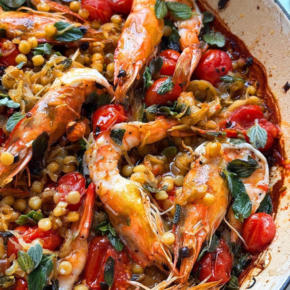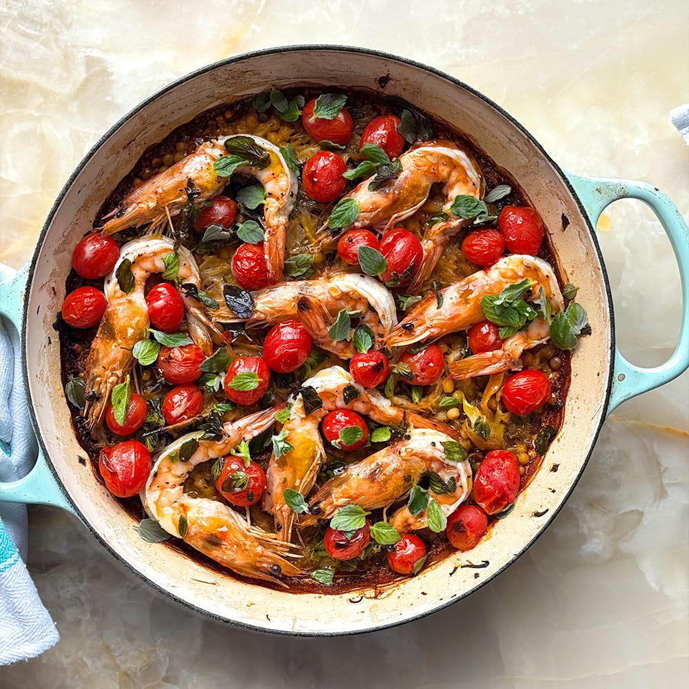 Once it soaks up the flavoured stock, the baked fregola turns glossy and rich. The prawns’ cooking time may vary, depending on your grill, so keep an eye. Serve this at the table, straight from the pan, in a totally informal way.