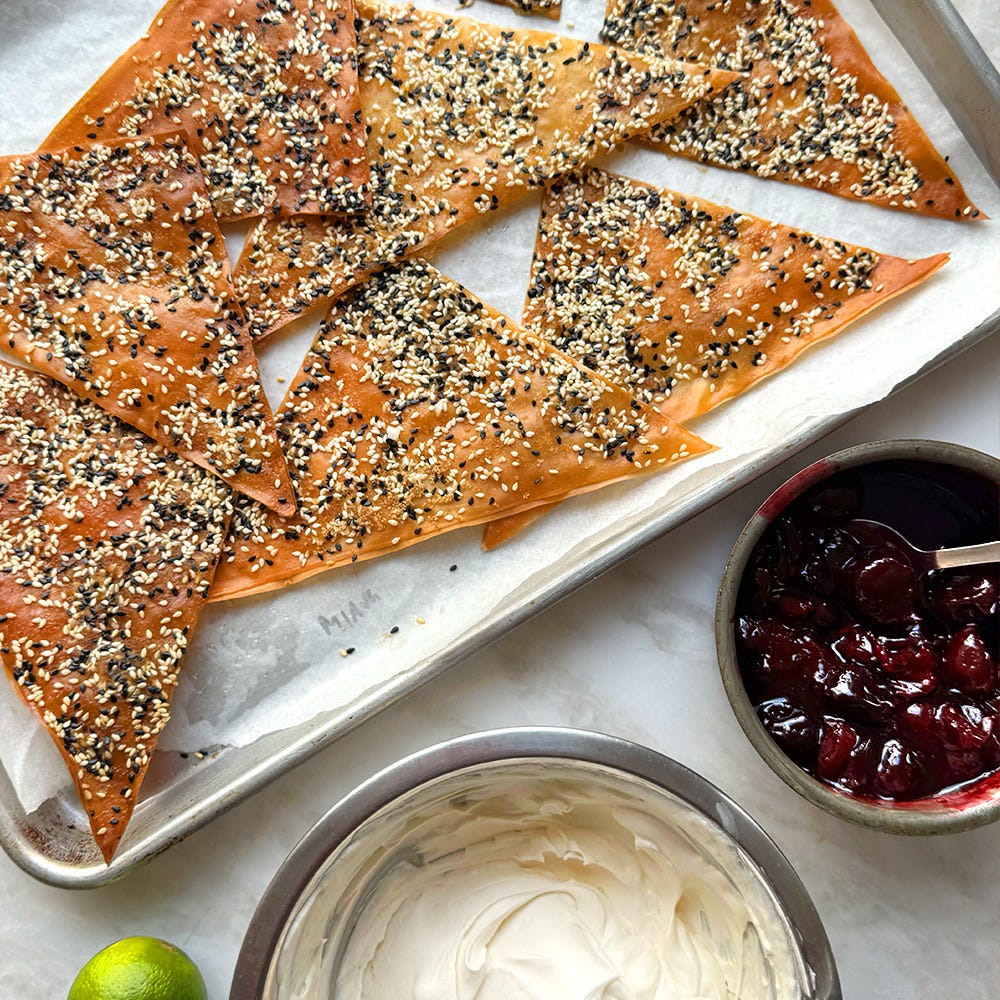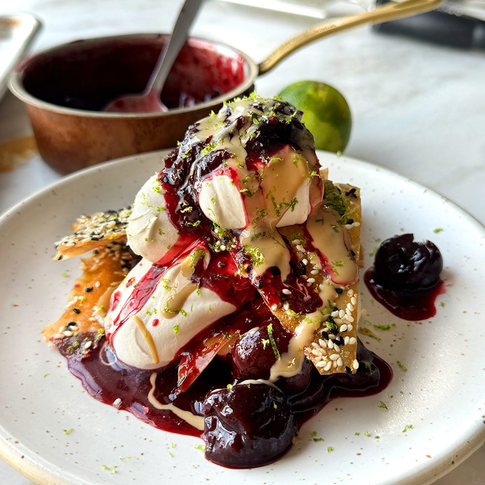 Sour cherry mess with sesame filo brittle