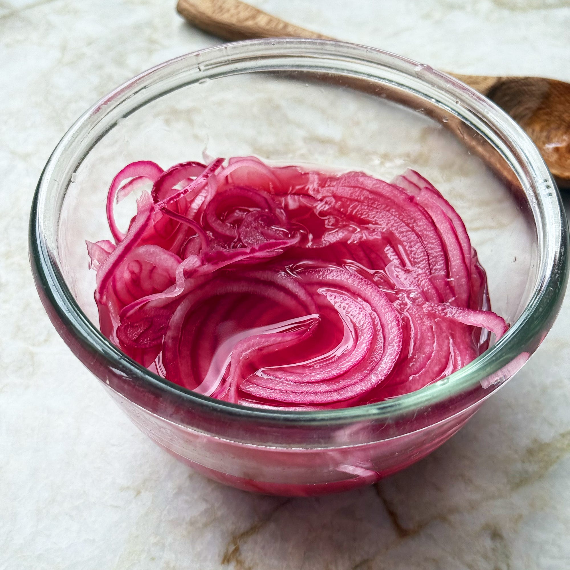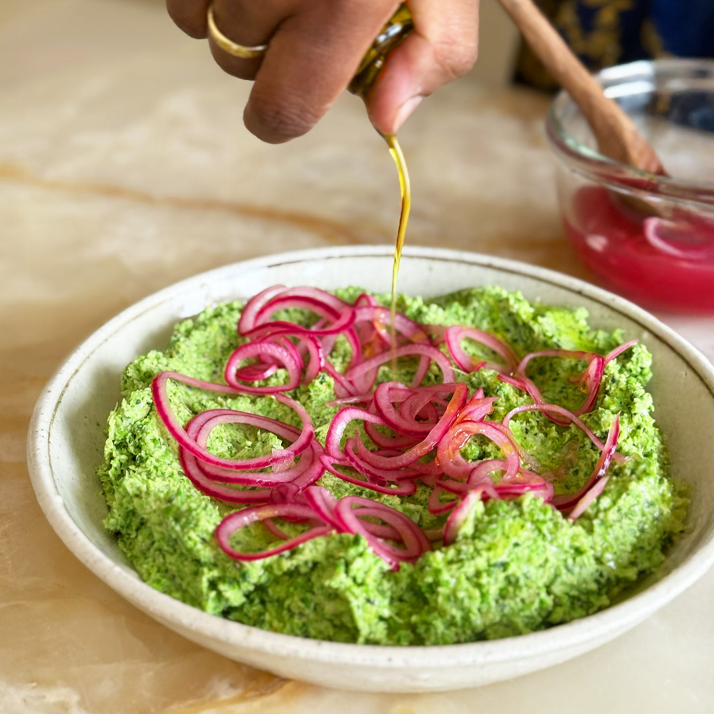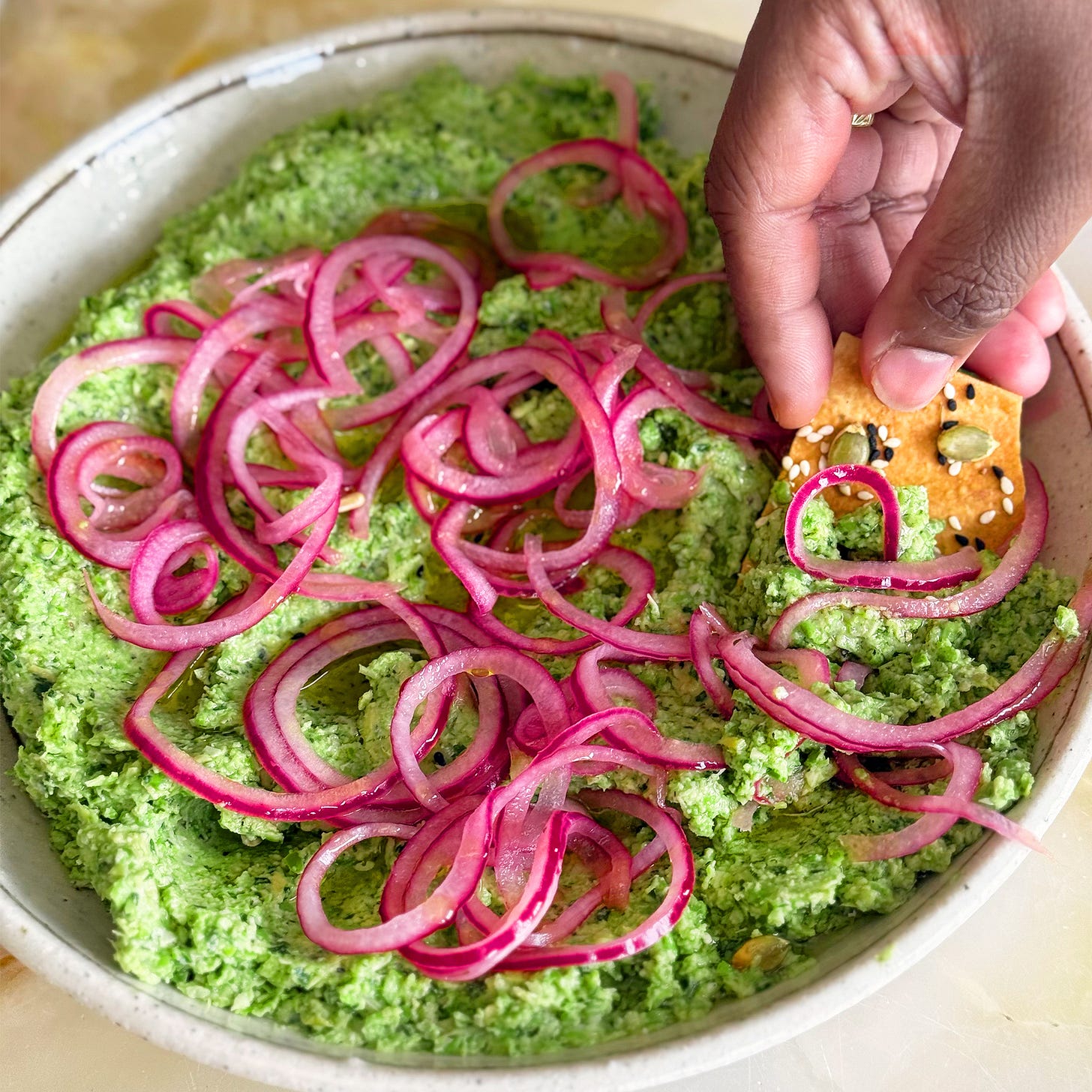 The pickled onions are the star here - sharp and sweet, cutting through the creamy pea and artichoke base. Make them the day before if you can; they only get better with time. The recipe makes more than you need, but they're brilliant in sandwiches. Add a sliced green chilli to the pickle if you want some heat.