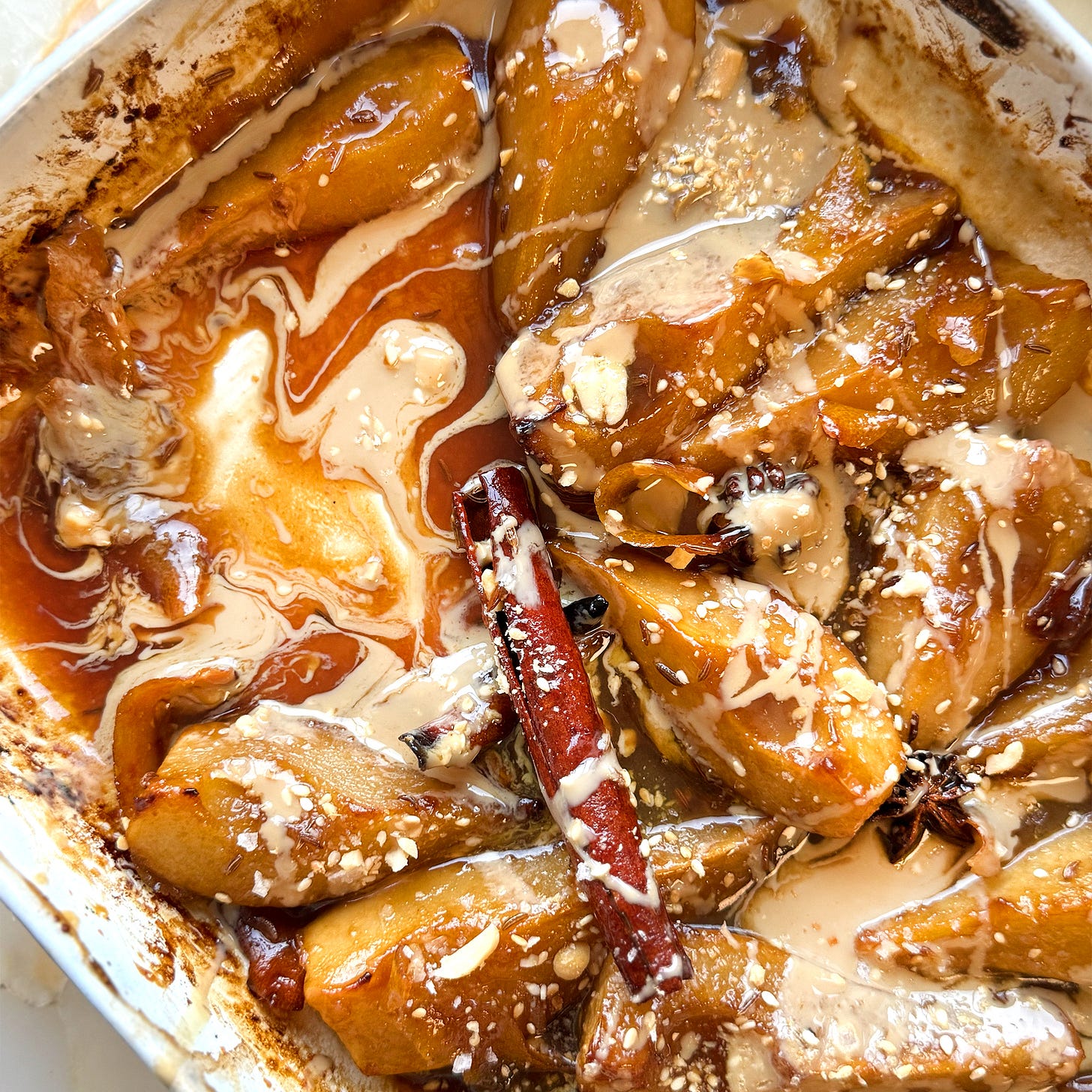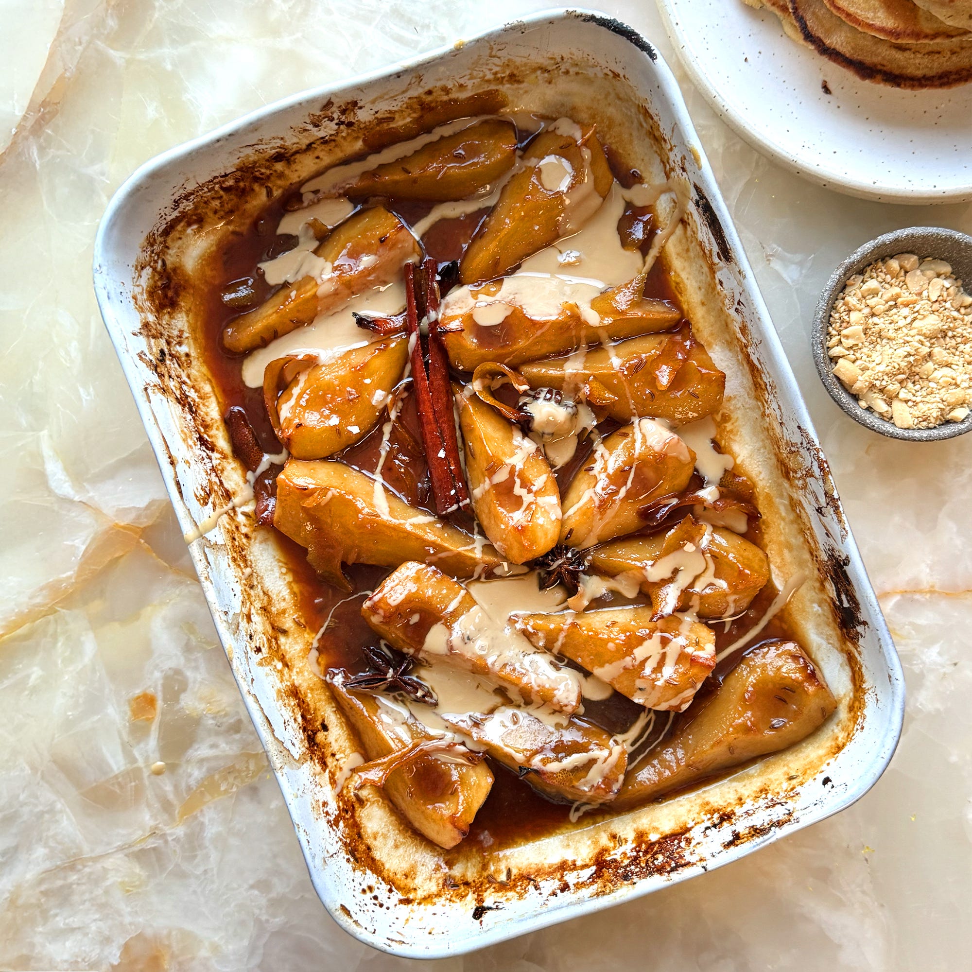 Though tasting pretty decadent, these pears are surprisingly easy to make. The miso, butter and spices meld together in the oven to create a delicious sauce for the pears - a perfect topping for pancakes (vegan or other), porridge or French toast.