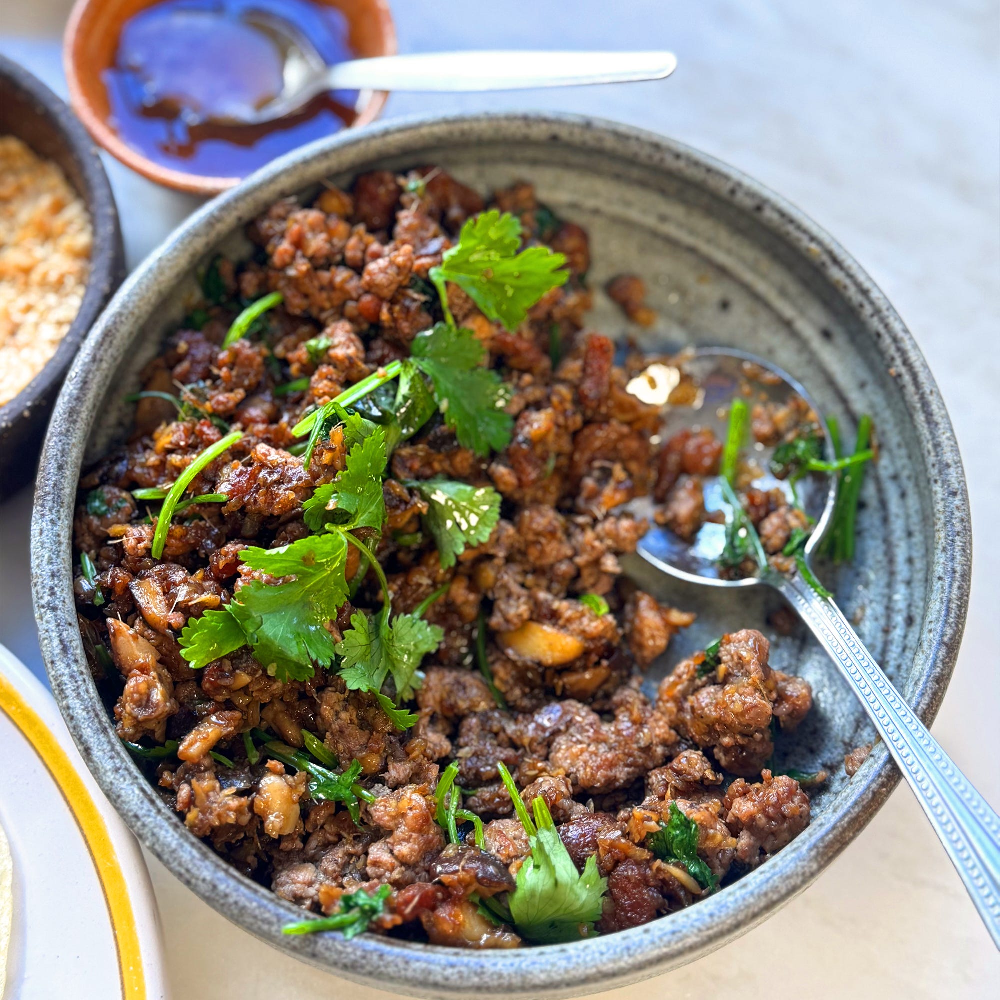 This Pancake Day, I’m mixing traditions. A spread of thin savoury pancakes that work as wrappers for 5-spice duck with shitake mushrooms, and miso butter baked pears to top up my vegan (or any) fluffy pancakes.
