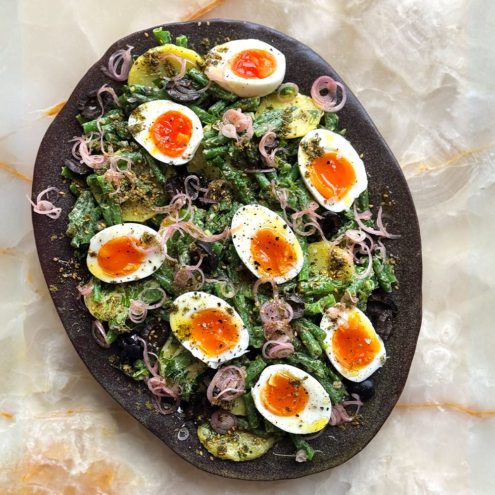 To serve, spread the bean mixture on a large plate, top with the eggs, olives and pickled shallots, and sprinkle the za’atar on top.