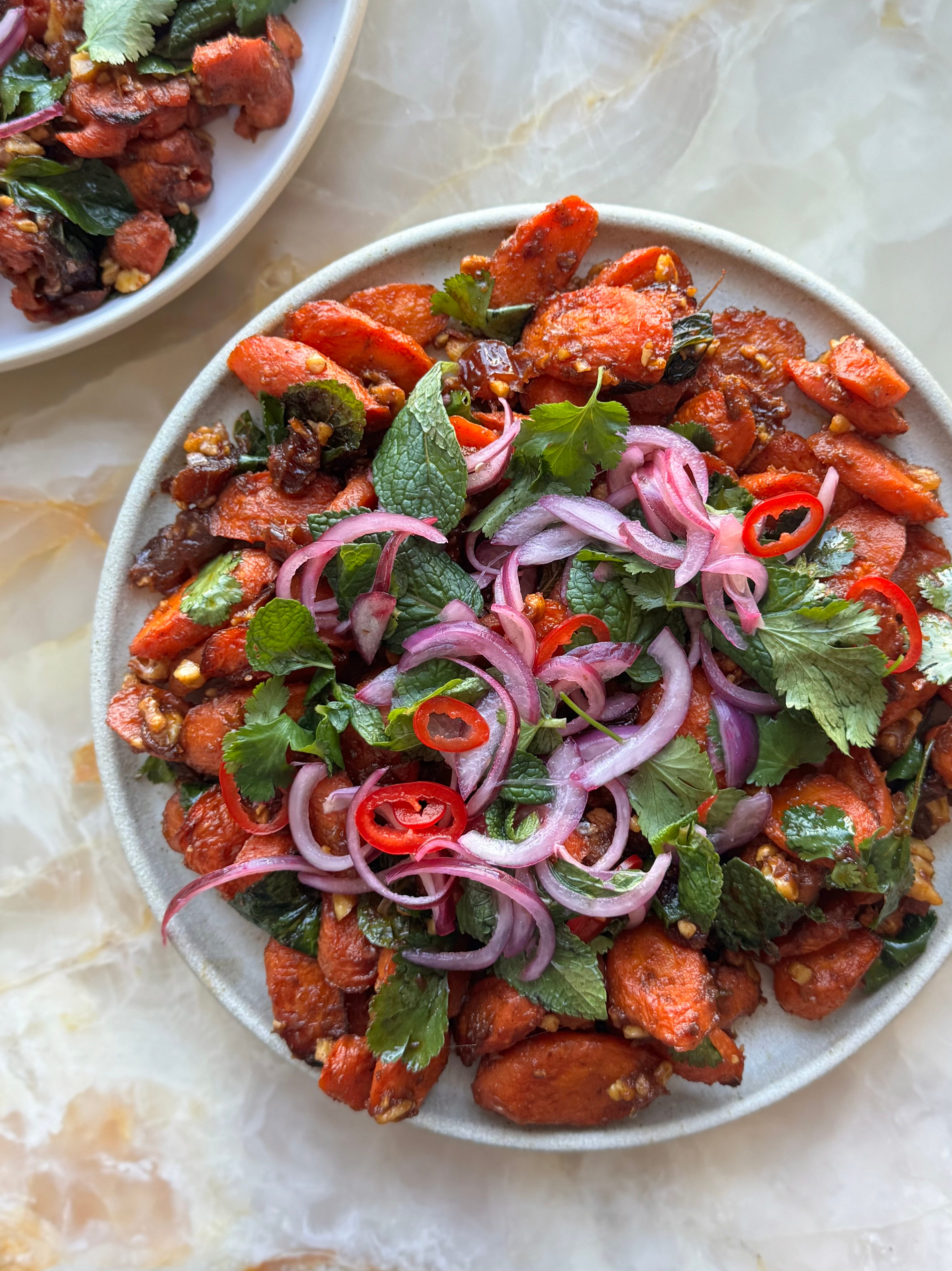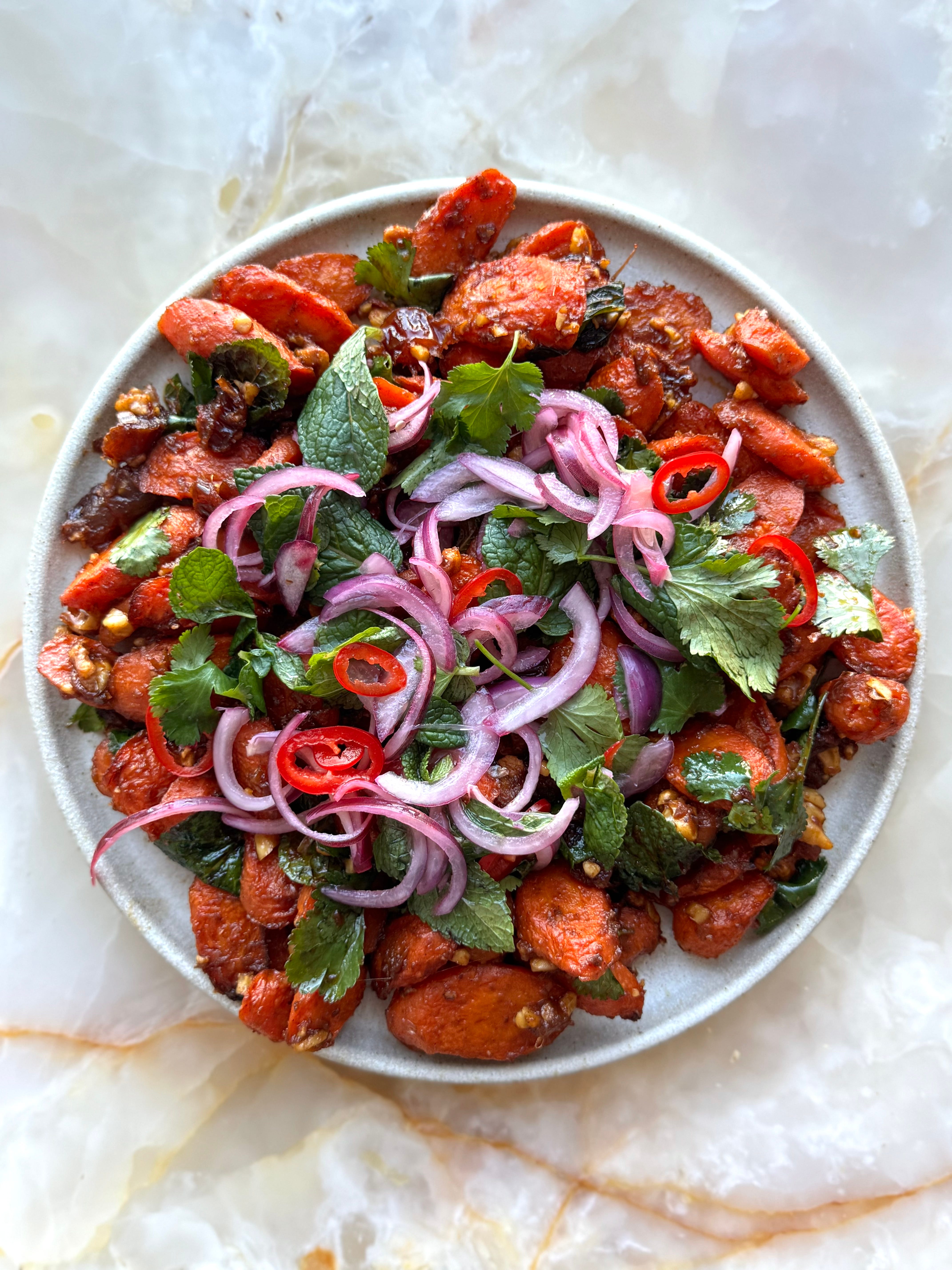 The dressing for these roasted carrots is made by melting dates with roughly chopped lemon and baharat to create a tangy, smokey and sweet sauce. It’s balanced out by the bright pickled onions and herbs. This can be served warm or at room temperature.