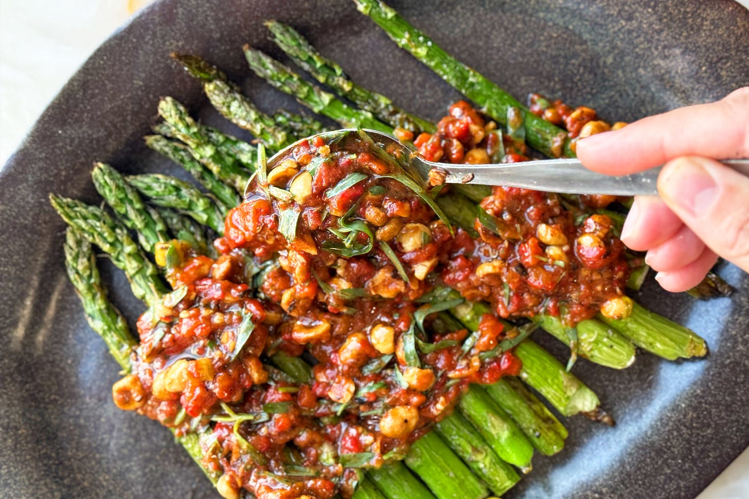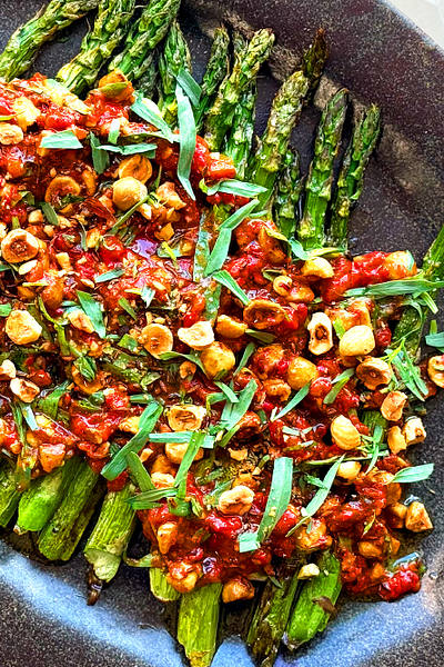 When asparagus first arrives, I usually hard sear it and drown it in butter. But by the third or fourth bunch, I start playing around. Pairing some roasted asparagus with this romesco sauce has become a favourite- smokey from the charred peppers, nutty from the hazelnuts, with that gentle cumin warmth all the way through. It's substantial enough to make asparagus feel like dinner, not just a side.