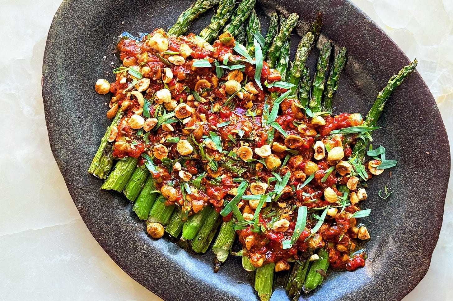 Spoon the pepper mixture onto a serving dish and top with the asparagus. Sprinkle over the remaining tarragon and hazelnut cumin mixture.